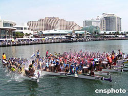 悉尼市2005年中國農(nóng)歷新年慶典活動(dòng)的壓軸戲——龍舟競賽,于19日和20日在達(dá)令港隆重舉行。此次龍舟競賽共有近百個(gè)龍舟隊(duì)參加,爭奪不同年齡組別的冠軍。上圖為開幕典禮上的服裝表演。下圖為龍舟隊(duì)員戲水慶祝比賽開幕.作者:劉雨生