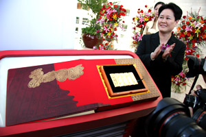 中國(guó)銀行股份有限公司今日還代表發(fā)行方和經(jīng)銷方將本次發(fā)行的具有特殊意義的二十九號(hào)一百克的“北京奧運(yùn)金”捐贈(zèng)給了第二十九屆奧林匹克運(yùn)動(dòng)會(huì)組織委員會(huì)作永久保留,表達(dá)社會(huì)各界對(duì)北京二00八年奧運(yùn)會(huì)的祝福和期盼。