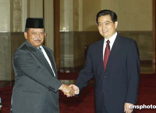 中新社北京二月二十八日電 (記者 朱大強(qiáng))中國(guó)國(guó)家主席胡錦濤今天在人民大會(huì)堂會(huì)見(jiàn)了馬來(lái)西亞最高元首西拉杰丁。