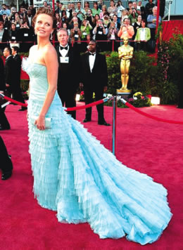 作為奧斯卡上屆影后的查理茲·塞隆,今年當(dāng)然不能在服裝上輸給“小輩”。一層層的細(xì)紗打成小褶羅列成寶塔形,讓人一望就是工藝不凡。層層疊疊的感覺外加淡淡的藍(lán)綠色調(diào),讓這位美女就像美人魚一般美麗動人。
