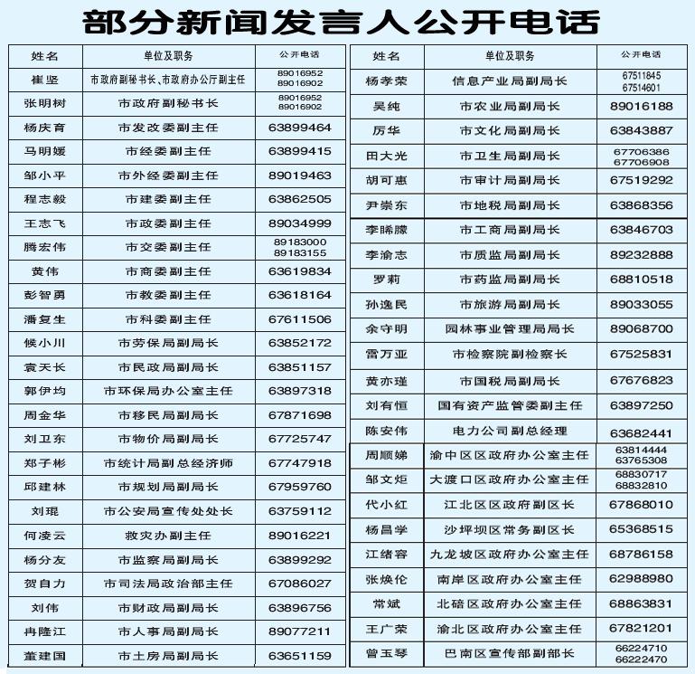 據(jù)介紹,重慶市如今共有140位政府新聞發(fā)言人。此次公布的,包括市政府、60個(gè)市級(jí)政府部門(mén)以及40個(gè)區(qū)(市)縣政府的新聞發(fā)言人的公開(kāi)電話。