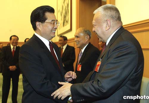 全國政協(xié)十屆三次會議三月三日在北京開幕,國家主席胡錦濤在大會開幕前與香港特首董建華互致問候。作者:廖文靜
