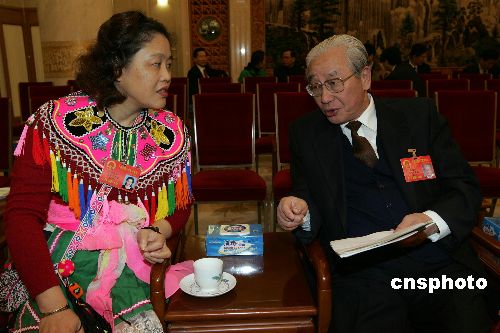 十屆全國人大三次會議三月五日在北京人民大會堂開幕,臺灣省代表楊國慶與胡亞芳在休息室交談。作者:毛建軍