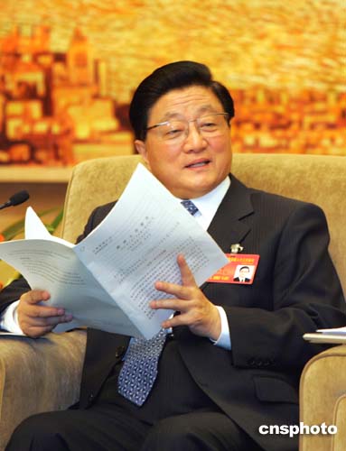 中共中央政治局常委、國務(wù)院副總理黃菊,三月六日到全國人大上海代表團(tuán)和代表們一起審議政府工作報告。作者:湯彥俊