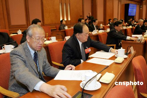 十屆全國人大三次會議主席團第二次會議三月七日在北京人民大會堂舉行,香港代表袁武(左)與澳門代表賀一誠在會上按表決器通過議程。作者:毛建軍