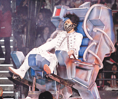 演唱會全場爆滿準時開始。舞臺以超時空科幻設(shè)計,機械臂緩緩上升,舞蹈員從天而降和從觀眾席跑上舞臺。戴銀黑色面具的基仔坐太空椅出場,以《必殺技》揭開序幕,額前藍色駁發(fā)和閃鉆耳環(huán)非常搶眼;兄笅屵湟瞾砼鯃,要求觀眾大力拍掌支持。