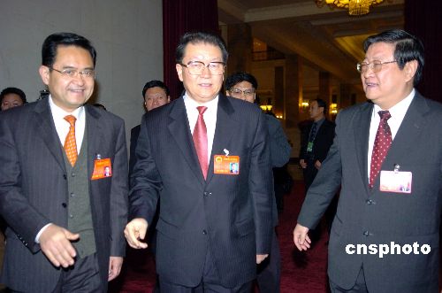 中共中央政治局常委李長春三月八日到全國人大河北代表團,與代表們一起審議《反分裂國家法(草案)》。圖為李長春與河北省委書記白克明(右)等交談。作者:陳文