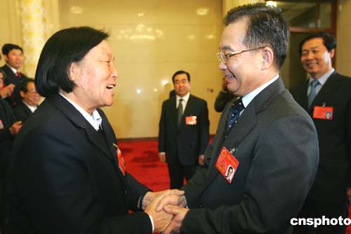 中共中央政治局常委、國(guó)務(wù)院總理溫家寶三月八日到全國(guó)人大山西省代表團(tuán)和代表們一起審議《反分裂國(guó)家法》草案。圖為溫家寶與連續(xù)十屆當(dāng)選山西人大代表的申紀(jì)蘭握手。作者:湯彥俊
