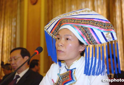 圖:廣西壯族女代表在審議“兩高”報(bào)告會議上發(fā)言