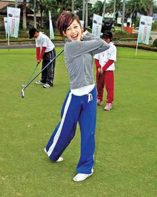 近來忙著宣傳“Honey”專輯的王心凌昨(9)日開心應兒童福利聯(lián)盟之邀,前往高爾夫球場大展球技,同行小朋友忙著要“心凌姊姊”簽名,簽完帽子簽T恤,少少10個人花了快20分鐘才搞定,讓她揮筆比揮桿手還酸。