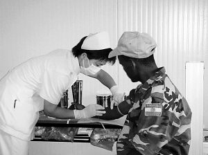 各項工作一展開,隊員們又發(fā)現(xiàn)了一項難題:語言溝通困難。盡管出征前她們都進(jìn)行過英語的突擊訓(xùn)練,但當(dāng)?shù)厝丝谥械挠⒄Z相對于標(biāo)準(zhǔn)英語來說,有如廣東話和普通話的區(qū)別。為了盡快適應(yīng)這里英語發(fā)音特點和習(xí)慣,女隊員們充分利用打針、護(hù)理的一切機(jī)會虛心學(xué)習(xí),將醫(yī)療隊變成了一個“非洲英語角”。