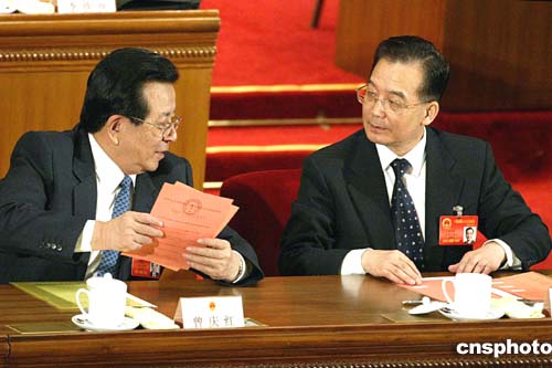 十屆全國人大三次會議第四次全體大會三月十三日在北京人民大會堂召開,胡錦濤當選為中華人民共和國中央軍事委員會主席。圖為國務(wù)院總理溫家寶和國家副主席曾慶紅領(lǐng)到選票。作者:廖文靜