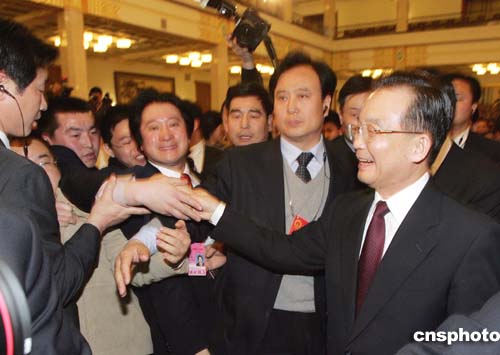 十屆全國人大三次會(huì)議三月十四日在北京人民大會(huì)堂閉幕,國務(wù)院總理溫家寶在閉幕會(huì)后舉行記者會(huì)。圖為溫總理在記者招待會(huì)結(jié)束后走到記者席前,與現(xiàn)場(chǎng)采訪的中外記者握手。作者:毛建軍