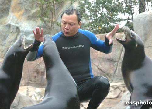 香港海洋公園的喂養(yǎng)員在每日喂海獅之前都要與海獅進行交流﹐以增進感情。作者:趙振清