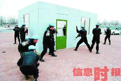 即使如此,他們?nèi)匀灰邮堋疤胤N兵”式的訓練。翻開厚厚的培訓課程表,短短一周內(nèi),防暴隊員們就要學習無線電通訊、反襲擊戰(zhàn)斗、反劫持人質(zhì)、自我心理調(diào)節(jié)等多門課程,進行戰(zhàn)術(shù)手語、擒敵拳、丁字棍、盾牌操、穿戴防暴盔甲服及防毒面具的訓練等。