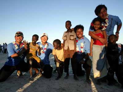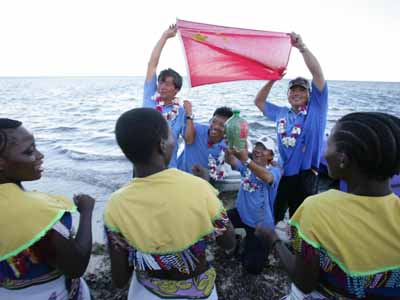 當(dāng)?shù)貢r(shí)間十九日晚,肯尼亞的專業(yè)合唱團(tuán)體以及少兒演員載歌載舞歡聚一堂,在蒙巴薩白沙海灘,以獨(dú)特的非洲風(fēng)情歌舞,盛迎抵達(dá)蒙巴薩的“鳳凰號”,以及前來迎接鳳凰號的中國客人。肯尼亞合唱團(tuán)用中文演唱的中國民歌《在那遙遠(yuǎn)的地方》博得全場熱烈掌聲。美麗的“二OO四肯尼亞小姐”朱麗葉、在肯留華校友會主席哪吒先生,與鳳凰衛(wèi)視主持人竇文濤和陳魯豫共同主持了晚會。完
