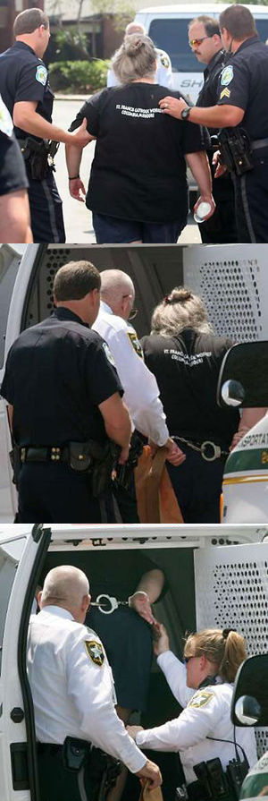圖為當(dāng)?shù)厥ジダ饰魉故刑熘鹘坦ぷ魅藛T賈科布被佛羅里達州警方以“非法侵入他人領(lǐng)地”罪逮捕。賈科布試圖偷偷將一瓶水帶給植物人夏沃。(固山)