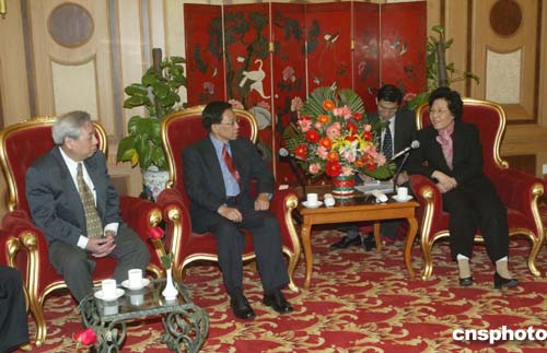 三月二十三日,中國國務院僑辦主任陳玉杰在北京世紀飯店會見吳顯揚(中)、關其煉(左一)團長率領的芝加哥中華會館訪華團。作者:史利