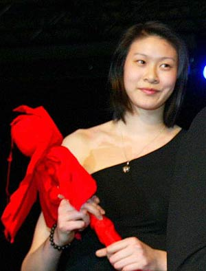 一襲黑色長(zhǎng)裙,露出半邊肩膀,是好萊塢剛流行過(guò)的式樣。趙蕊蕊顯然是無(wú)法習(xí)慣這樣性感的裝束,羞答答地上了臺(tái)。直到迎上帥哥索普贊許的眼神,更是露出一臉羞澀的笑容。“還真不習(xí)慣這樣穿,別扭極了。”說(shuō)話聲音一如平時(shí)的爽朗,“還是運(yùn)動(dòng)衣更符合我的氣質(zhì)。”這樣的曳地長(zhǎng)裙,還會(huì)再穿么?“也許不會(huì)了吧!