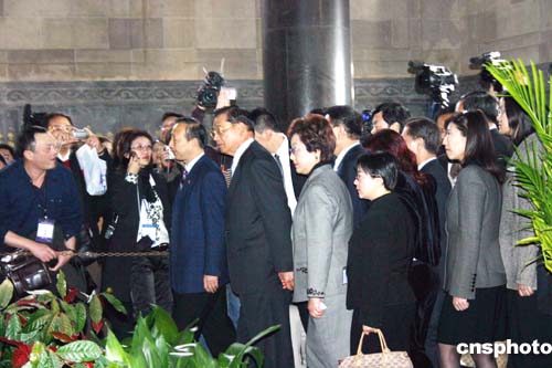 三月三十日上午九點,國民黨參訪團(tuán)拜謁中山陵的祭拜儀式正式開始。江丙坤代表中國國民黨主席連戰(zhàn)及全體國民黨黨員向中山陵敬獻(xiàn)花籃。參訪團(tuán)所有成員均向?qū)O中山遺像三鞠躬并默哀一分種。圖為參訪團(tuán)所有成員在孫中山陵寢旁繞場一周,瞻仰孫中山遺像。作者:陳旻