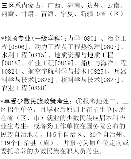 二、體現(xiàn)了統(tǒng)籌兼顧、協(xié)調(diào)發(fā)展的原則。根據(jù)我國東西部地區(qū)經(jīng)濟、教育發(fā)展不平衡的現(xiàn)實狀況,對報考西部地區(qū)和少數(shù)民族地區(qū)的考生以及少數(shù)民族考生采取適度照顧的政策。對礦業(yè)、地質(zhì)等11個艱苦專業(yè)繼續(xù)采取適當(dāng)照顧政策。