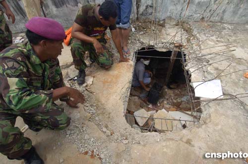 圖:救援人員從廢墟里尋找印尼強(qiáng)震死難者