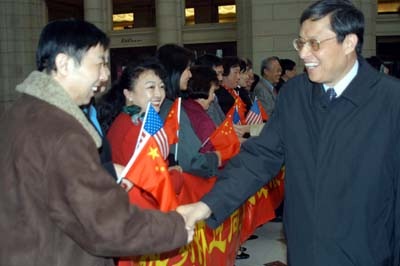 三日中午,在華盛頓聯(lián)合火車(chē)站,周文重大使偕夫人謝淑敏受到中國(guó)駐美使館外交官、大華盛頓地區(qū)僑學(xué)界代表、美國(guó)國(guó)務(wù)院助理國(guó)務(wù)卿幫辦薛瑞福以及禮賓司官員的熱烈歡迎。