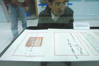 在100平方米左右的展廳里,存放在玻璃展柜中的一份顏色微紅、長約一米的文件特別顯眼,文件的右側(cè)有兩個紅色的繁體大字“國書”。這是1950年由我國首任駐瑞典大使耿飆呈遞給瑞典國王的國書復(fù)制件,完全按照當年新中國第一批國書的標準復(fù)制,大小及式樣與原件一模一樣。它是特別從瑞典外交部那里復(fù)制得來的,因為國書是交給外國的,本國自己不保存。
