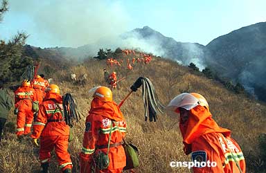 4月4日,河北省井徑縣南王莊鄉(xiāng)蘆莊村的金華寺山旅游景點(diǎn),發(fā)生大面積火災(zāi)。河北省森林防火應(yīng)急分隊(duì)武警緊急出動(dòng)300余名兵力趕赴火災(zāi)現(xiàn)場,經(jīng)過5個(gè)多小時(shí)的激烈奮戰(zhàn),終將熊熊大火撲滅。據(jù)查大火由清明燒紙引發(fā)。圖為武警官兵奔赴目的地。作者:余洪恩