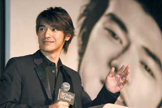 昨天的發(fā)布會(huì)設(shè)在劇場(chǎng)里面,舞臺(tái)兩邊早已掛起金城武最新拍攝的兩張碩大海報(bào),一張溫文爾雅,一張則性感十足。當(dāng)金城武出現(xiàn)時(shí),先是全場(chǎng)一片漆黑,然后又是一陣強(qiáng)光和一團(tuán)煙霧,他一個(gè)人孤零零地站在寬大舞臺(tái)上接受著下面的驚聲尖叫,這種架勢(shì)持續(xù)了好幾分鐘,使得他不好意思地站起身來,一會(huì)兒摸摸腦袋,一會(huì)兒又把手插進(jìn)褲袋。而當(dāng)主持人不斷向他拋來“你簡(jiǎn)直驚若天人”、“你身上有卓然不同的男人氣質(zhì)”等贊美之語(yǔ)時(shí),他雙手緊握著麥克風(fēng),不斷彎腰說謝謝。當(dāng)主持人問他喜歡現(xiàn)場(chǎng)掛的哪張廣告照片時(shí),金城武謙虛地說:“不要再夸我了,其實(shí)突然看見這么大一張自己的臉,我覺得很別扭。”