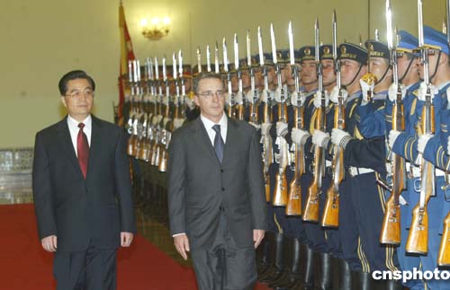 四月六日,中國國家主席胡錦濤在北京人民大會(huì)堂主持儀式,歡迎哥倫比亞總統(tǒng)烏里韋來華訪問。作者:史利