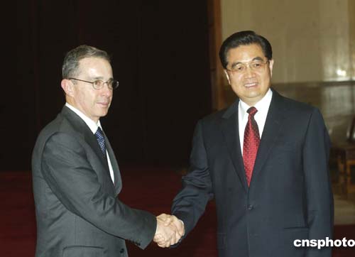 圖:胡錦濤會(huì)見哥倫比亞總統(tǒng)烏里韋