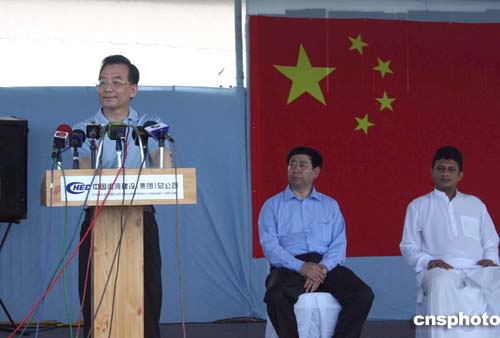 中國(guó)國(guó)務(wù)院總理溫家寶四月九日上午頂著炎炎烈日,來(lái)到科倫坡以南的帕納杜拉漁港,看望受海嘯災(zāi)區(qū)災(zāi)民。圖為溫家寶出席漁港的重建儀式,并發(fā)表講話。作者:齊彬