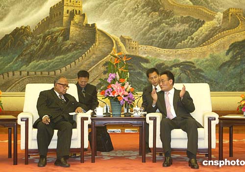 四月十二日,全國人大常委會委員長吳邦國在北京與孟加拉國民議會議長穆罕默德·賈米爾烏丁·西爾卡舉行會談。作者:廖文靜