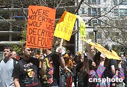 世界銀行春節(jié)會(huì)議在華盛頓舉行之際,美國示威者于美東時(shí)間4月16日中午到世行大樓外集會(huì),抗議美國國防部副部長沃爾福威茨出任世界銀行新任行長。作者:余東暉