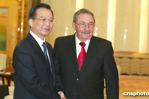 中國(guó)國(guó)務(wù)院總理溫家寶四月十八日在北京會(huì)見了古共中央第二書記、國(guó)務(wù)委員會(huì)第一副主席兼部長(zhǎng)會(huì)議第一副主席勞爾·卡斯特羅。作者:滿會(huì)喬
