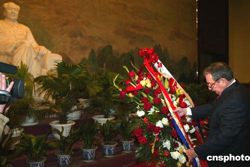 今天的參觀原本不在勞爾此次北京之行的行程安排當(dāng)中,中方應(yīng)勞爾的要求臨時(shí)增加了這項(xiàng)活動(dòng)。勞爾于今天下午四點(diǎn)多抵達(dá)毛主席紀(jì)念堂,在北門外下車后步行來到紀(jì)念堂內(nèi)毛主席座像前,敬獻(xiàn)花圈并三鞠躬致敬。隨后,勞爾一行靜靜地瞻仰了毛主席遺容。