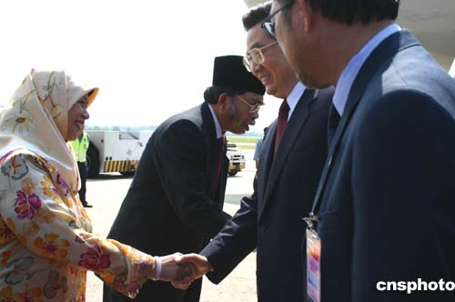 中新網(wǎng)4月20日電(記者 李靜)中國國家主席胡錦濤乘專機(jī)抵達(dá)文萊,文萊王儲(chǔ)夫婦到機(jī)場迎接。