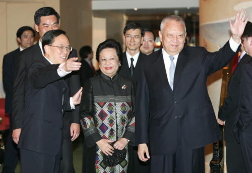 董建華伉儷甫到場(chǎng),即成為嘉賓和傳媒的焦點(diǎn)。他邊走下樓梯邊向大家揮手示好,更率先與署理行政長官曾蔭權(quán)握手打招呼。由于嘉賓不少是其昔日工作的好拍檔,就是日常接觸的好朋友,董建華對(duì)他們甚有親切感,全程笑容可掬,不斷握手、揮手打招呼,輕松、無負(fù)擔(dān)的心情顯而易見。董氏伉儷和曾蔭權(quán)更應(yīng)傳媒要求,站定讓傳媒攝錄和拍照。