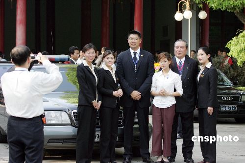 連戰(zhàn)的長(zhǎng)子連勝文(右四)四月二十七日在南京參觀中國(guó)近代史遺址博物館時(shí),與臺(tái)灣著名藝人、亞洲影帝柯俊雄(右二)以及當(dāng)?shù)氐膶?dǎo)游小姐們一起合影。作者:毛建軍