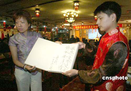 看到連戰(zhàn)神情頗為愉悅,茶館總經(jīng)理尹智君抱著試試看的心理,走到連戰(zhàn)面前,希望他為老舍茶館題詞,不料連戰(zhàn)欣然應(yīng)允,揮毫寫下:“振興茶文化,祥和兩岸情”。