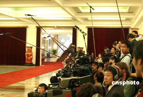 四月二十九日下午,中共中央總書記胡錦濤在北京會見中國國民黨主席連戰(zhàn)。大批海內(nèi)外媒體記者云集人民大會堂見證這一歷史時(shí)刻。作者:廖文靜