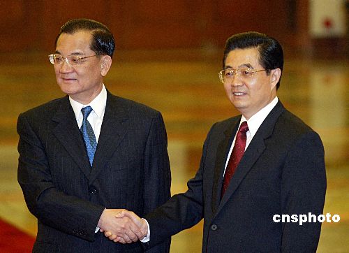 其時(shí),兩位領(lǐng)導(dǎo)人同著深色西服,胡錦濤系紅色領(lǐng)帶,連戰(zhàn)系藍(lán)色領(lǐng)帶。