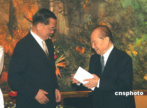 連戰(zhàn)并向汪老贈(zèng)送了辜振甫夫人托他轉(zhuǎn)交的兩件禮物,一是辜老先生生前的一幅親筆畫作,另一個(gè)則是辜振甫夫人嚴(yán)倬云女士的信件。