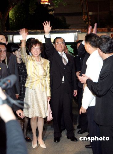 約九時(shí),連戰(zhàn)與夫人等一行乘車(chē)來(lái)到這里。媒體發(fā)現(xiàn)后,踴躍上前拍照、攝影,市民們高呼連戰(zhàn)先生的名字,本來(lái)預(yù)留的通道已無(wú)法通過(guò);連戰(zhàn)與身著金黃色套裝的夫人連方瑀下車(chē),愉快地與市民揮手致意,或許為安全及此間正常秩序考慮,一行人約一分鐘后離開(kāi)當(dāng)?shù)亍?/p>