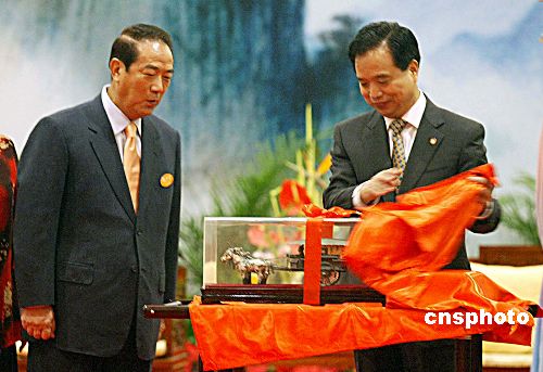 五月五日,中共陜西省委書記李建國在西安會見親民黨主席宋楚瑜,并贈送銅車馬作為禮物。作者:廖文靜
