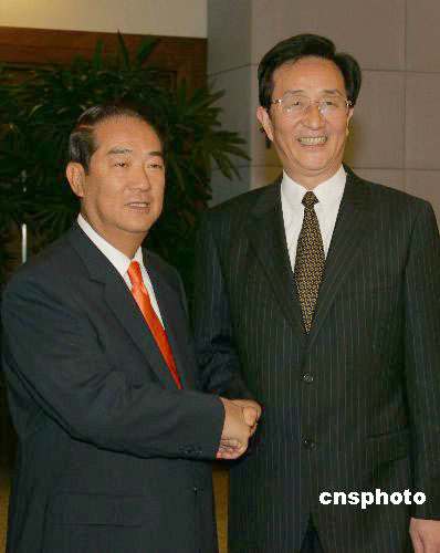 五月七日晚,中共中央政治局委員、上海市委書記陳良宇在上海科技館會見了親民黨主席宋楚瑜率領的親民黨大陸訪問團一行。作者:潘索菲