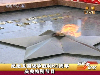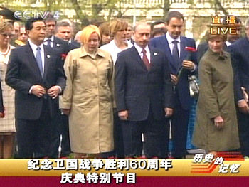 5月9日,俄羅斯在莫斯科紅場舉行紀念衛(wèi)國戰(zhàn)爭勝利60周年慶典。圖為各國元首向無名烈士墓獻花,中國國家主席胡錦濤出席儀式。(央視截圖)