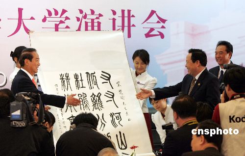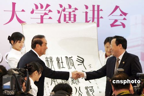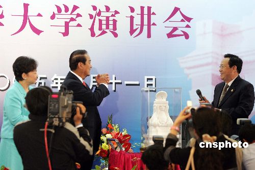 五月十一日上午,親民黨主席宋楚瑜在清華大學發(fā)表演講,并回答學生們的提問。演講后,清華大學校長顧秉林向宋楚瑜贈送禮物。作者:毛建軍