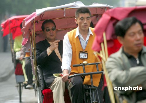 今日上午九時四十分許,四十余輛紅頂紅塌的人力三輪車隊搭載宋楚瑜一行,穿游什剎海的悠長胡同,行抵恭王府。豪宅門側(cè)為愛新覺羅.溥杰所題:恭王府花園。宋楚瑜笑稱自己愛看《大宅門》等歷史劇,對老北京文化也素有好感,因此慕名而至。